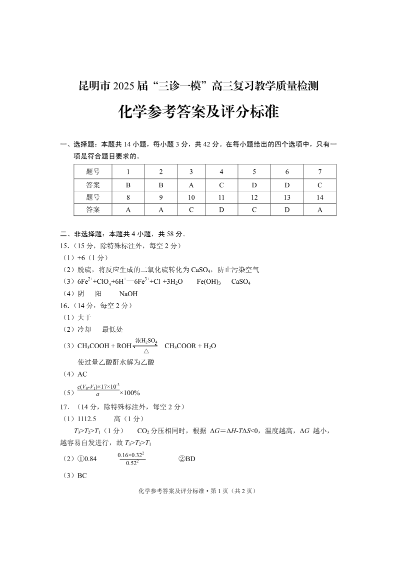 云南省昆明市2024-2025学年“三诊一模”高三复习教学质量检测化学答案
