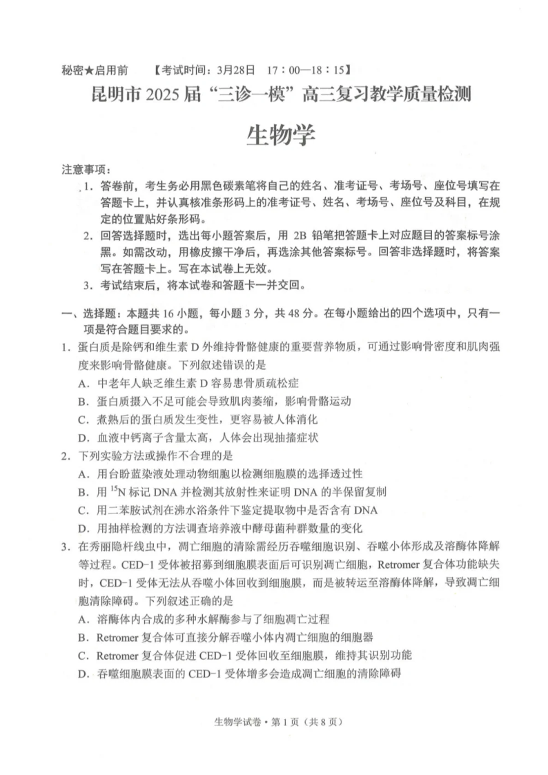 云南省昆明市2024-2025学年“三诊一模”高三复习教学质量检测生物