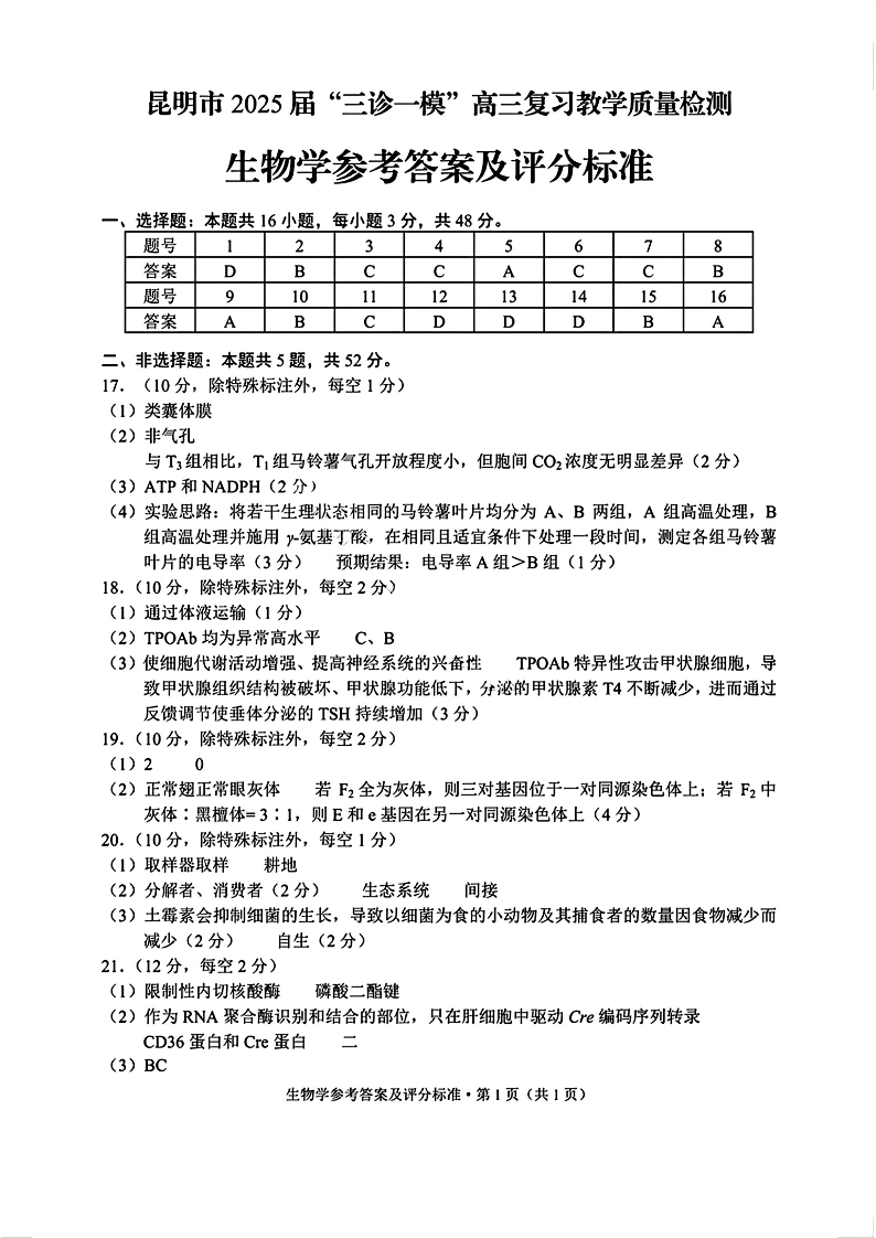云南省昆明市2024-2025学年“三诊一模”高三复习教学质量检测生物答案