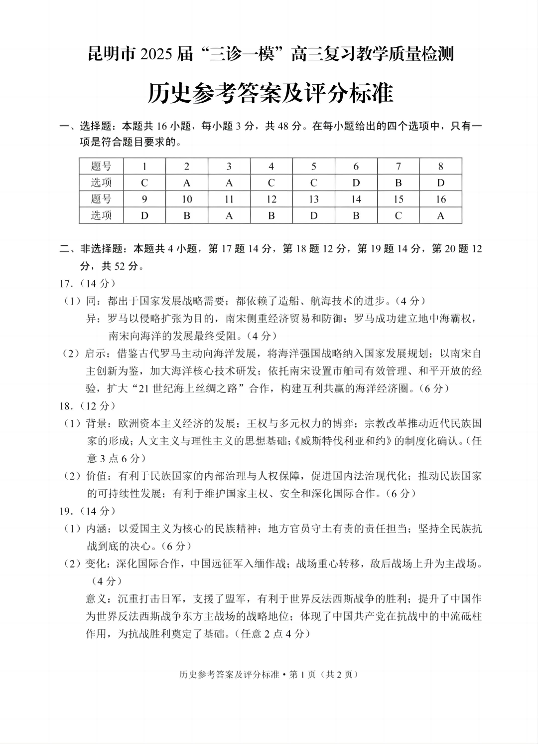 云南省昆明市2024-2025学年“三诊一模”高三复习教学质量检测历史答案