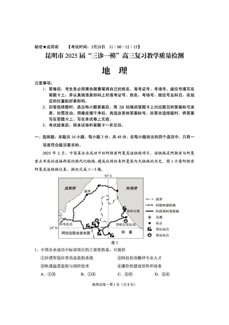云南省昆明市2024-2025学年“三诊一模”高三复习教学质量检测地理