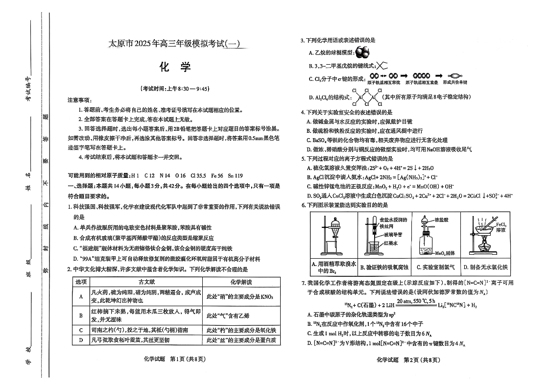 山西省太原市2024-2025学年下学期3月高三一模考试化学