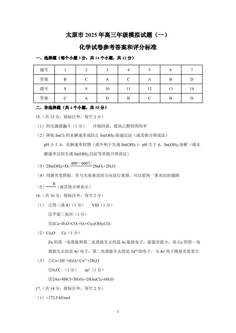 山西省太原市2024-2025学年下学期3月高三一模考试化学答案
