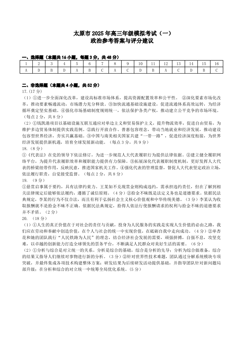 山西省太原市2024-2025学年下学期3月高三一模考试政治答案
