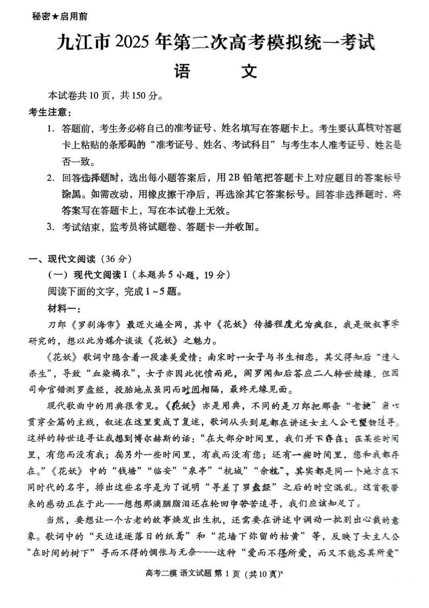 江西省九江市2024-2025学年下学期3月高三二模统一考试语文+答案