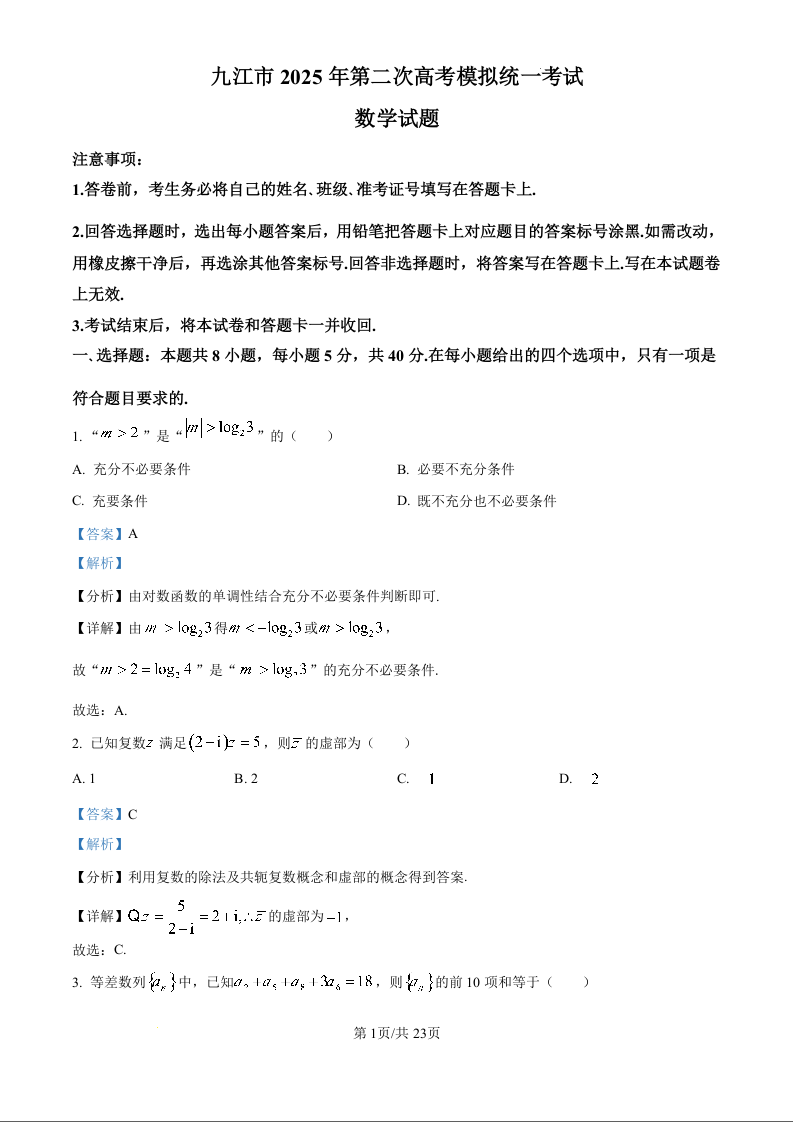江西省九江市2024-2025学年下学期3月高三二模统一考试数学(精品解析版)