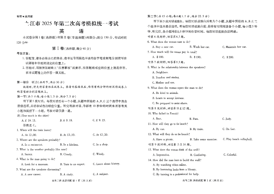 江西省九江市2024-2025学年下学期3月高三二模统一考试英语