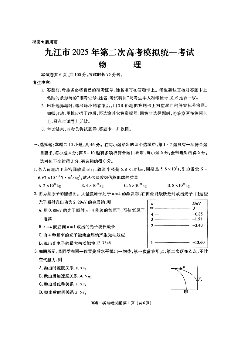 江西省九江市2024-2025学年下学期3月高三二模统一考试物理
