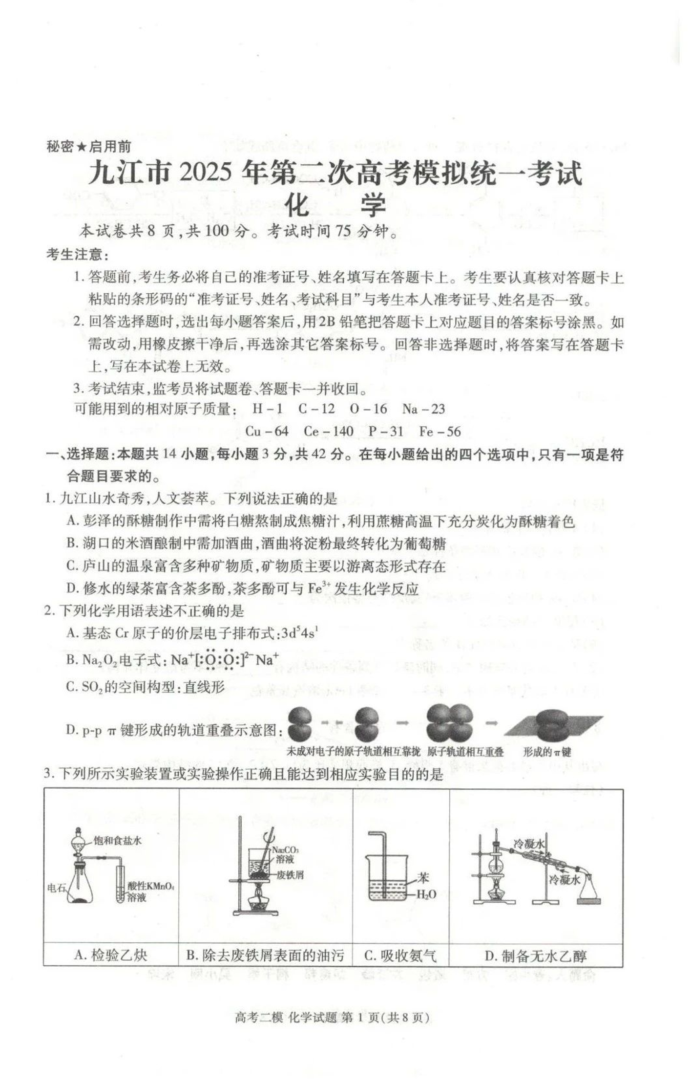 江西省九江市2024-2025学年下学期3月高三二模统一考试化学答案