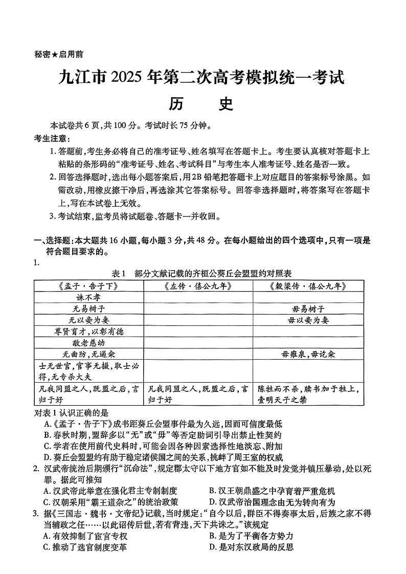 江西省九江市2024-2025学年下学期3月高三二模统一考试历史