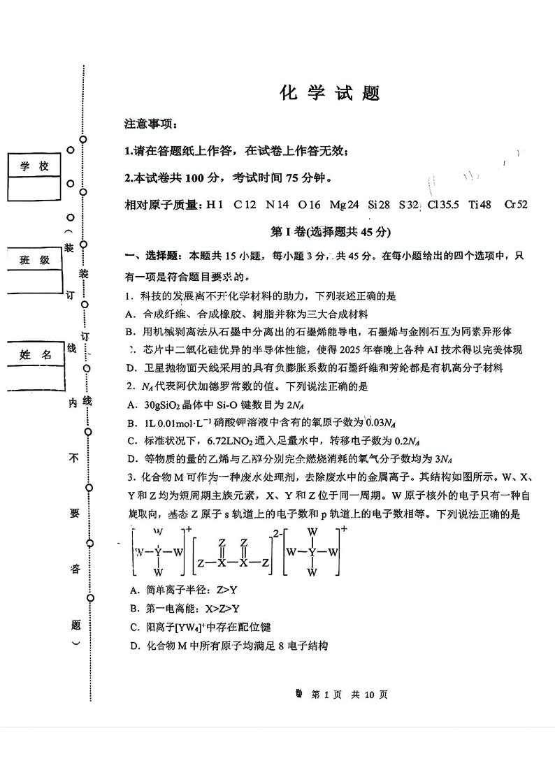 黑龙江省齐齐哈尔市2024-2025学年下学期3月高三二模考试化学
