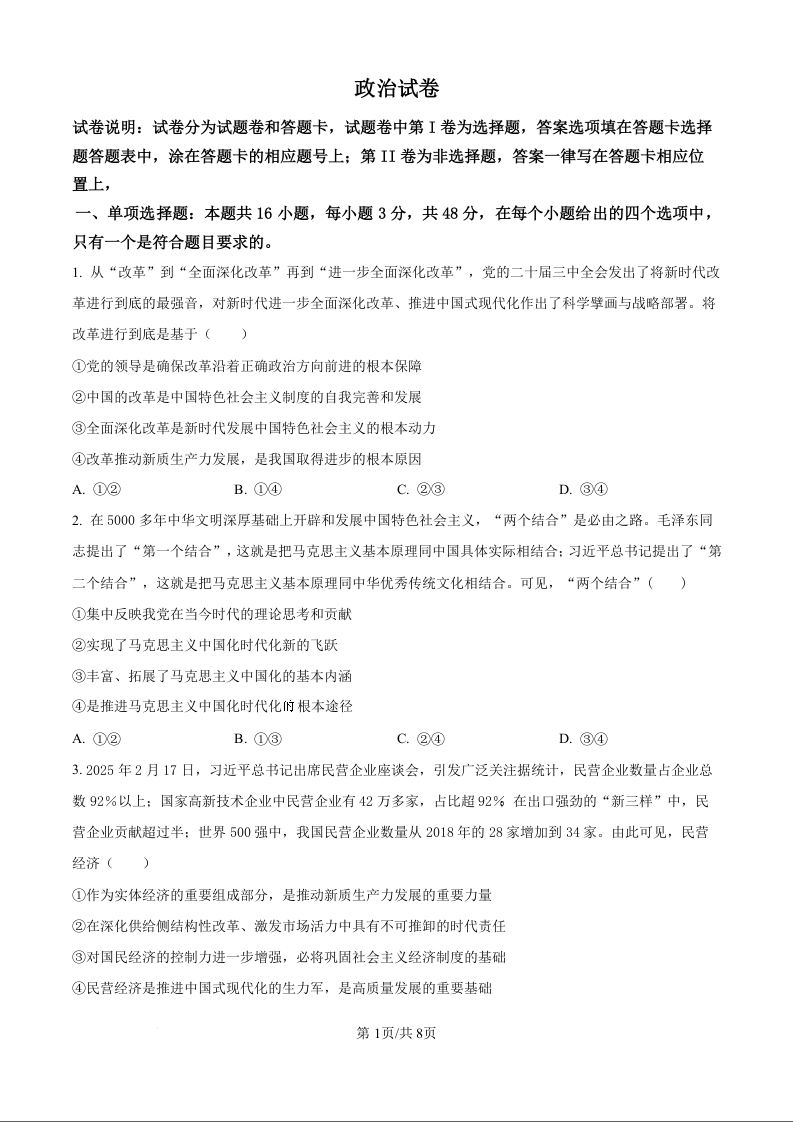 黑龙江省齐齐哈尔市2024-2025学年下学期3月高三二模考试政治
