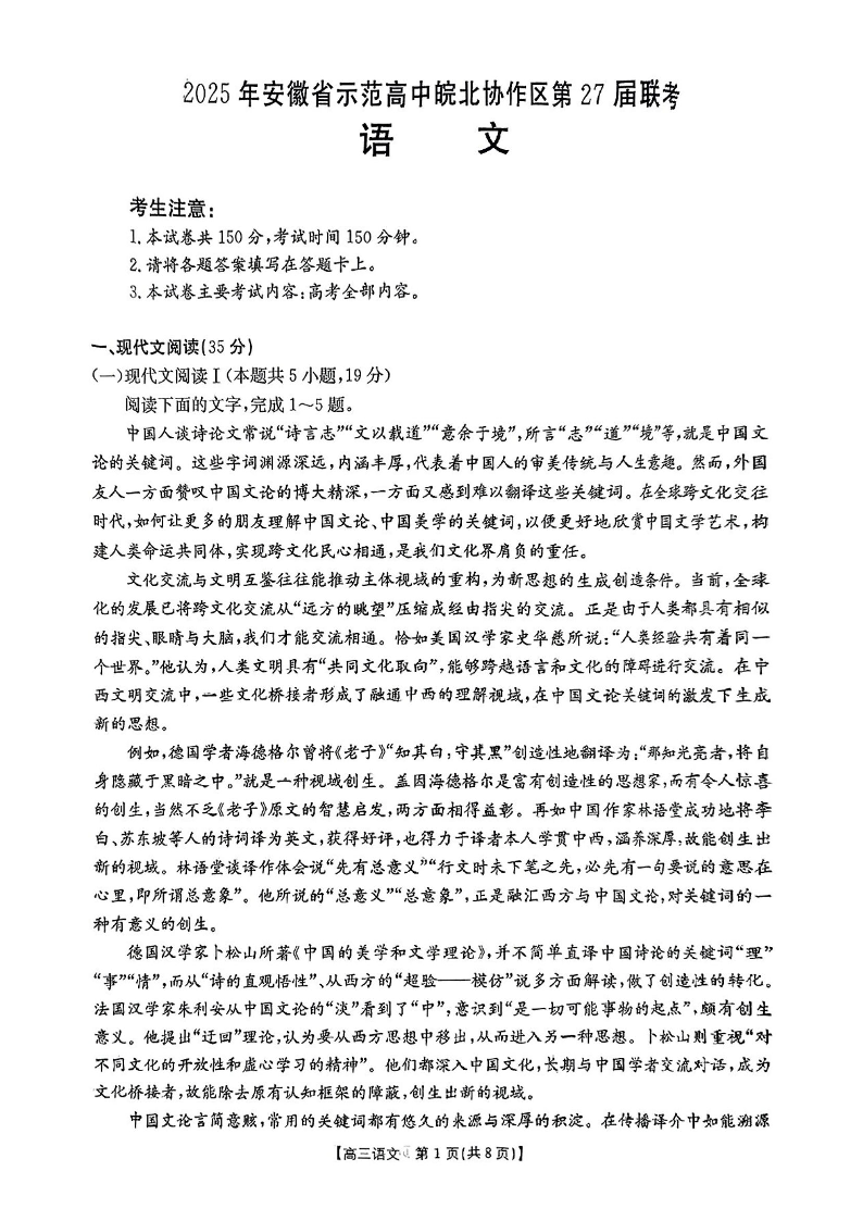 安徽省示范高中皖北协作区2024-2025学年高三第27届联考语文