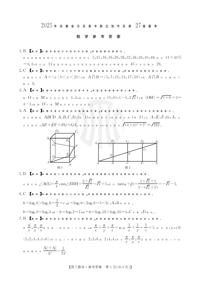 安徽省示范高中皖北协作区2024-2025学年高三第27届联考数学答案