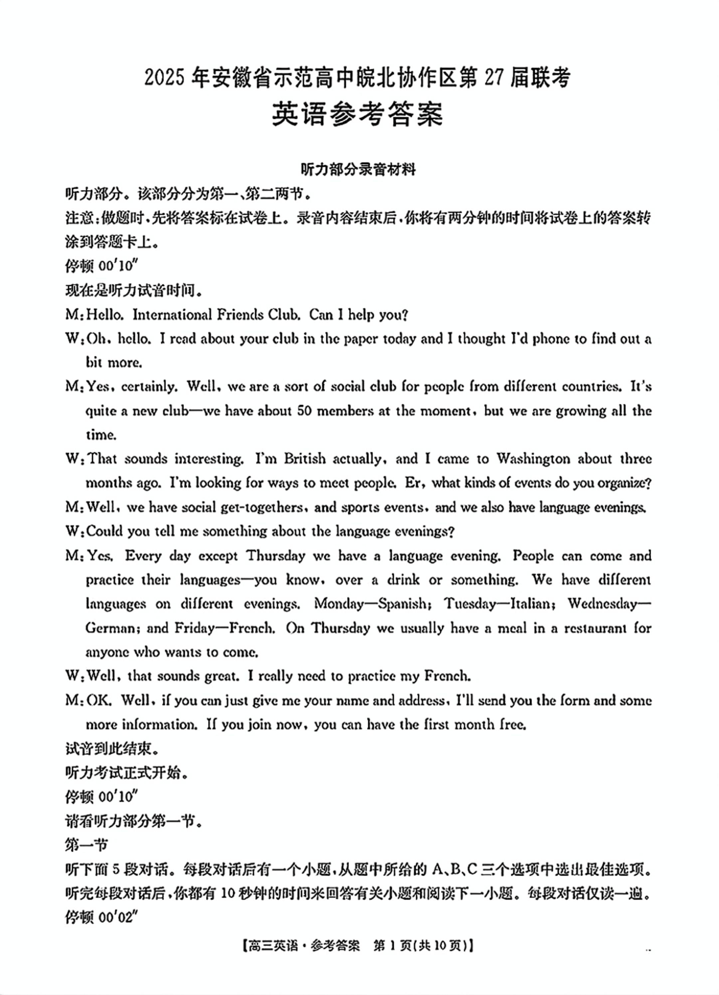 安徽省示范高中皖北协作区2024-2025学年高三第27届联考英语答案