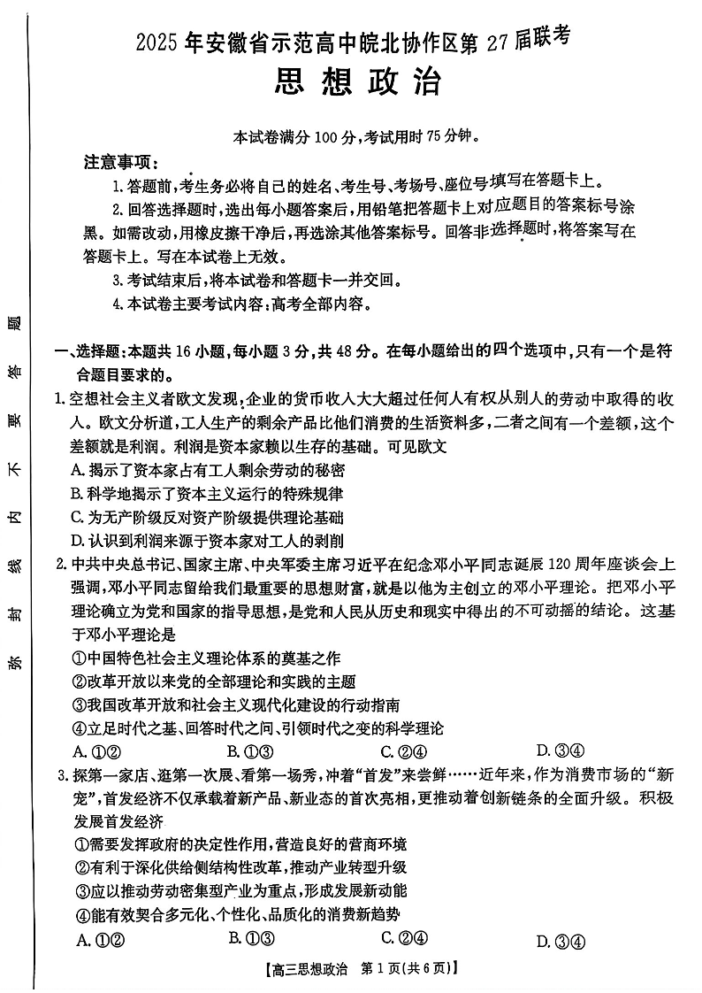 安徽省示范高中皖北协作区2024-2025学年高三第27届联考政治
