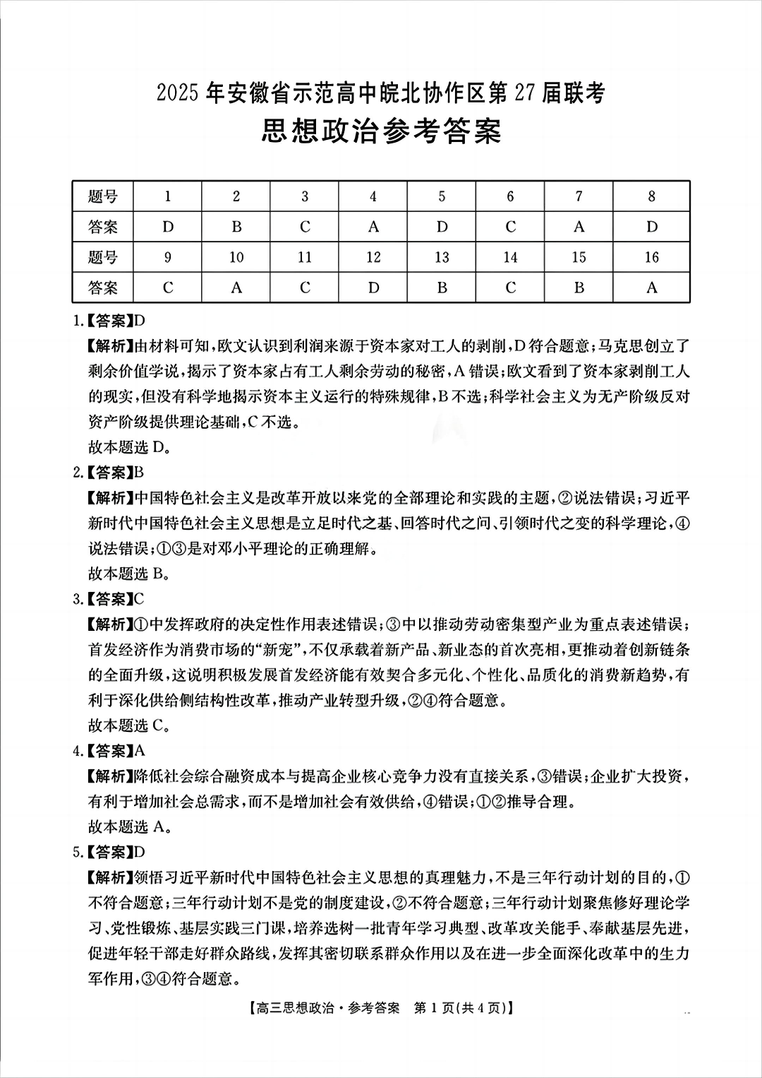 安徽省示范高中皖北协作区2024-2025学年高三第27届联考政治答案