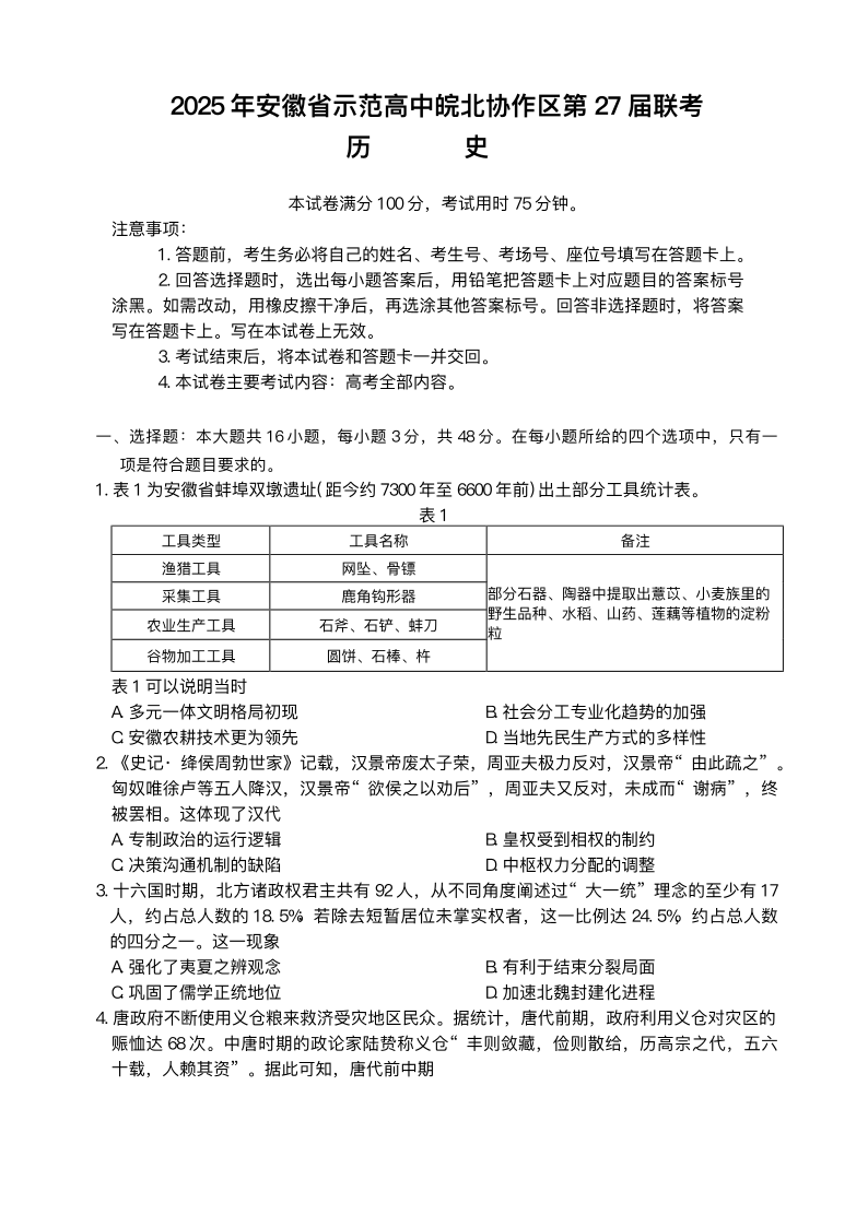 安徽省示范高中皖北协作区2024-2025学年高三第27届联考历史