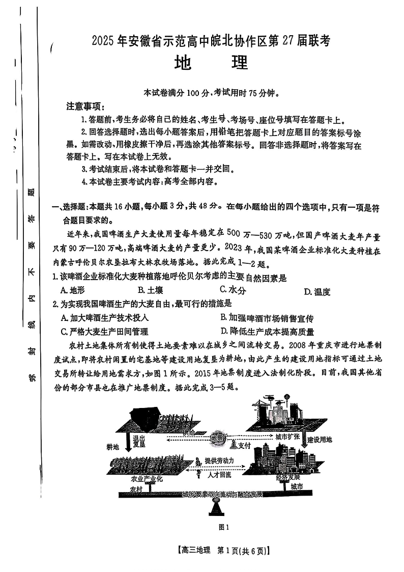 安徽省示范高中皖北协作区2024-2025学年高三第27届联考地理