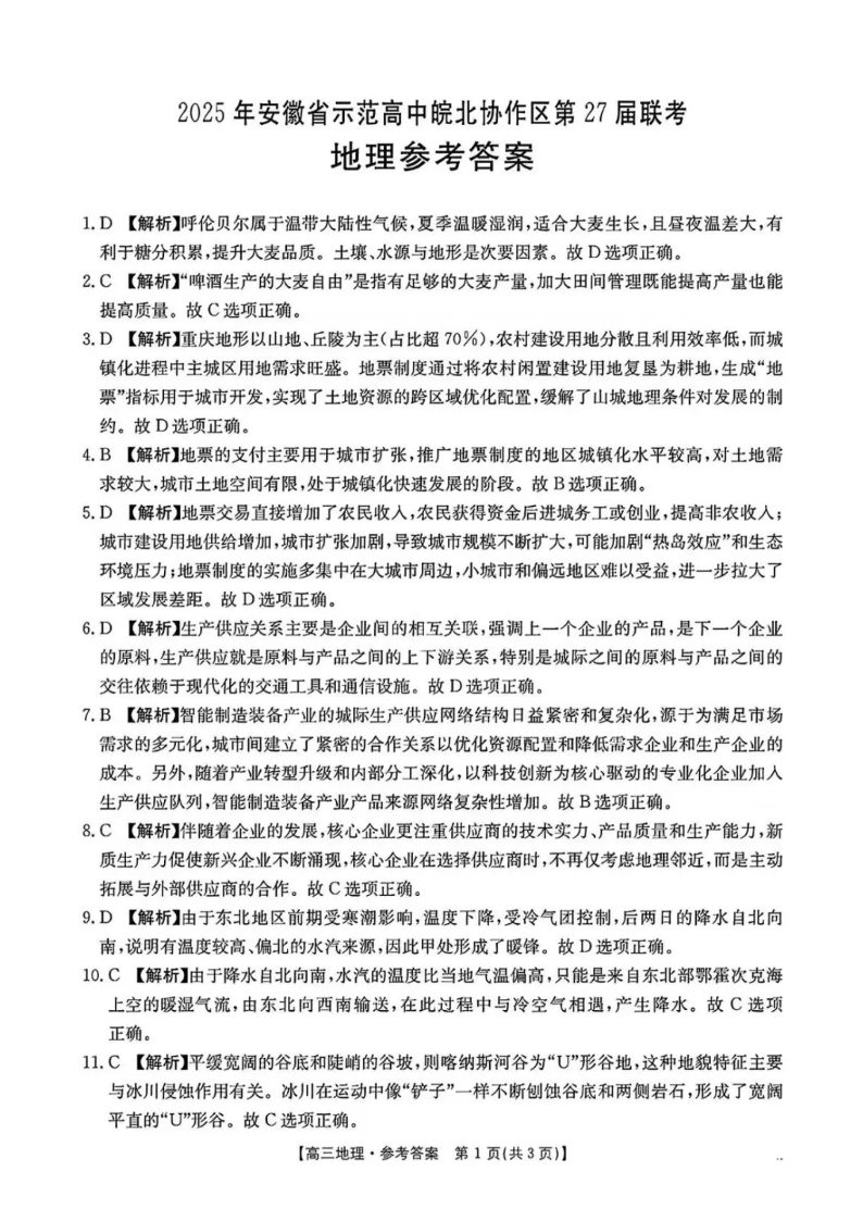 安徽省示范高中皖北协作区2024-2025学年高三第27届联考地理答案
