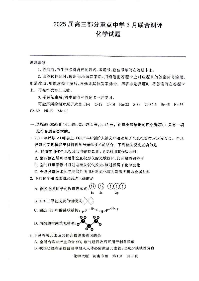 八省八校重点中学2024-2025学年下学期3月联合测评化学+答案(河南版)