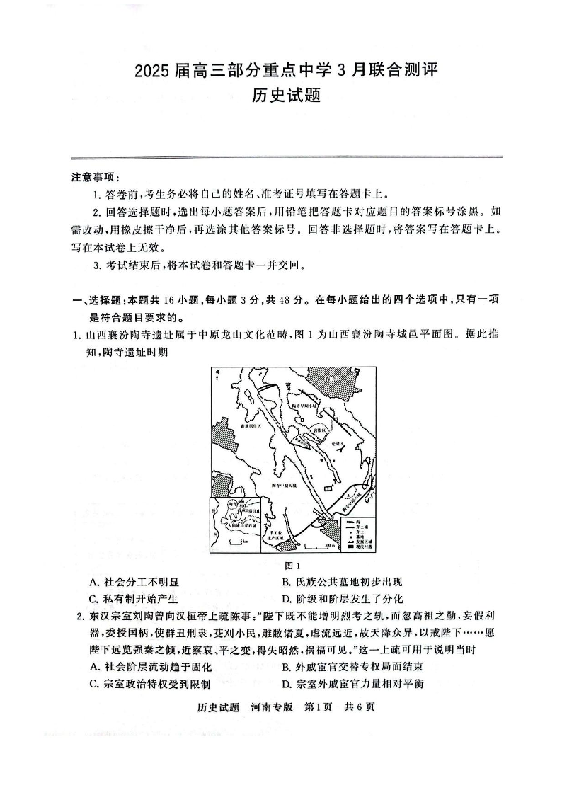 八省八校重点中学2024-2025学年下学期3月联合测评历史(河南版)