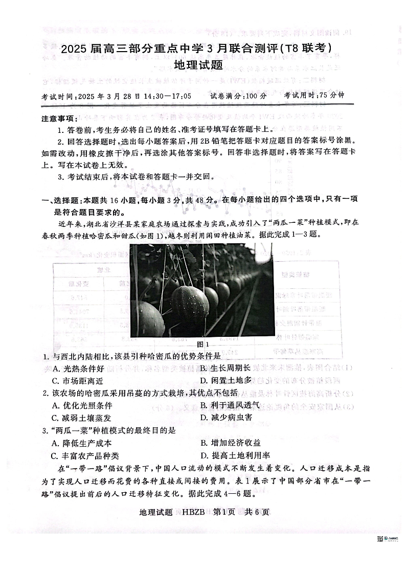 八省八校重点中学2024-2025学年下学期3月联合测评地理+答案(河北版)
