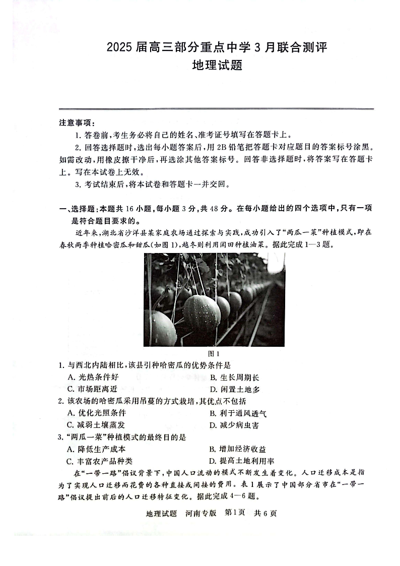 八省八校重点中学2024-2025学年下学期3月联合测评地理+答案(河南版)