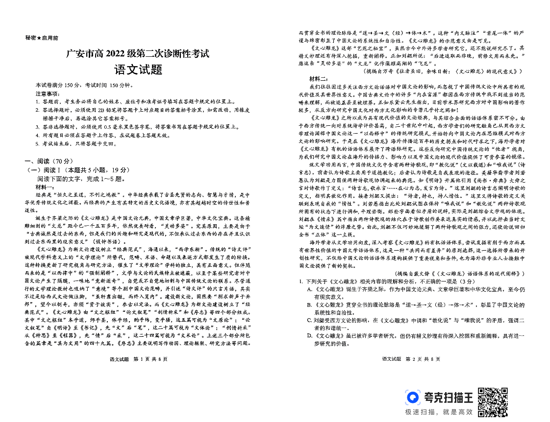 四川省广安等六市2024-2025学年下学期高三二诊考试语文