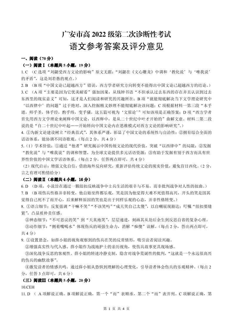 四川省广安等六市2024-2025学年下学期高三二诊考试语文答案