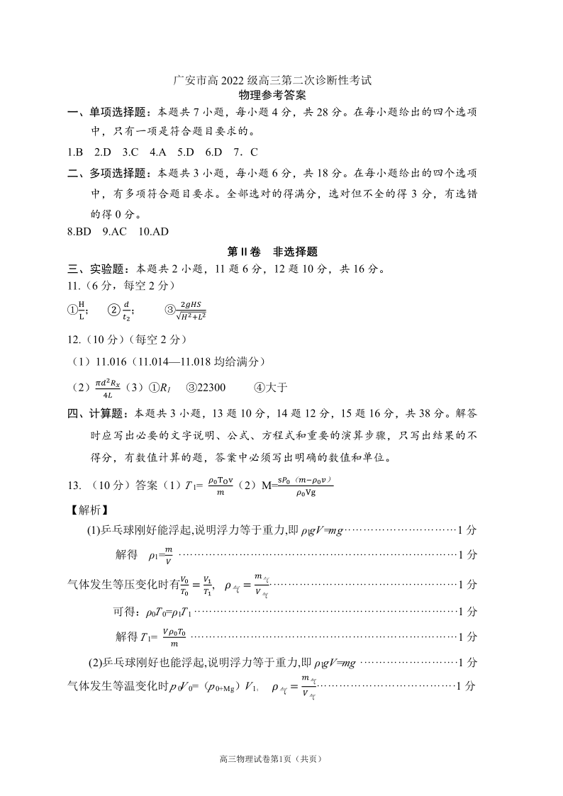 四川省广安等六市2024-2025学年下学期高三二诊考试物理答案