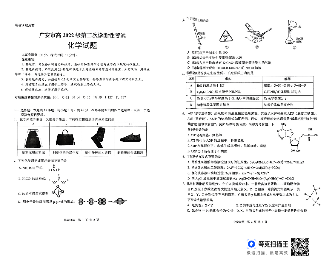 四川省广安等六市2024-2025学年下学期高三二诊考试化学