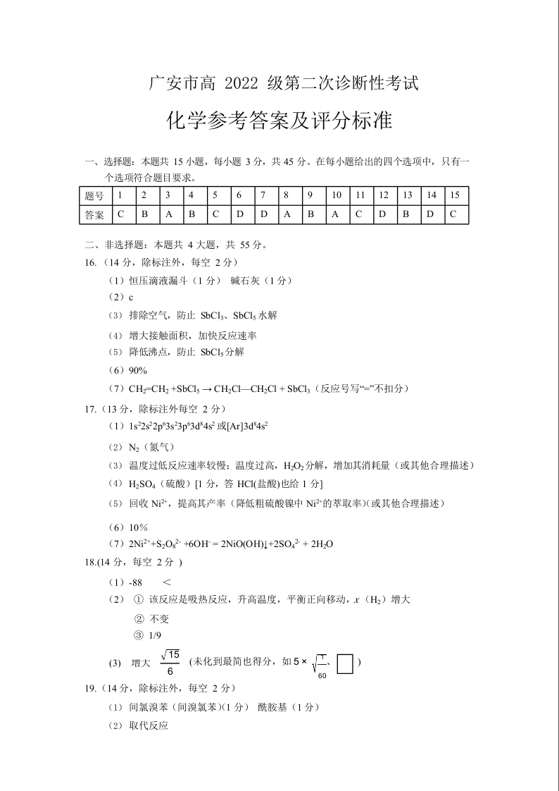 四川省广安等六市2024-2025学年下学期高三二诊考试化学答案