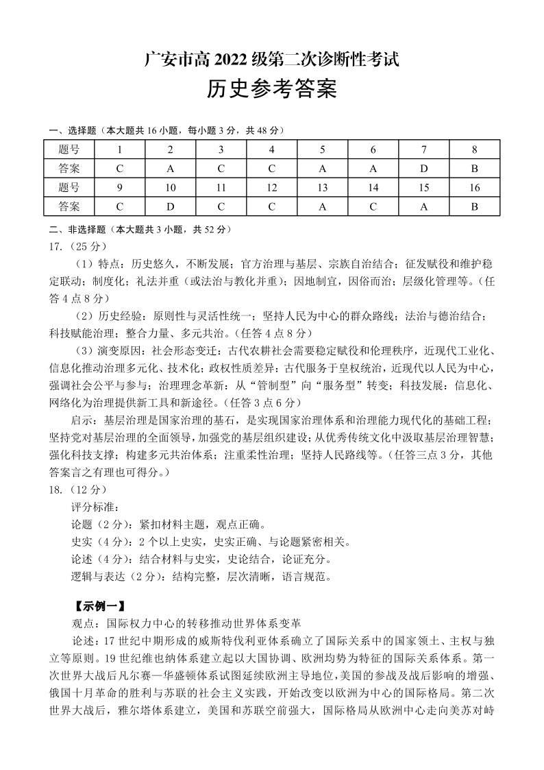 四川省广安等六市2024-2025学年下学期高三二诊考试历史答案