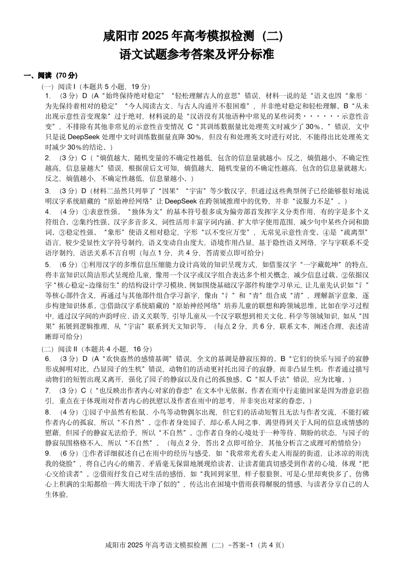 陕西省咸阳市2024-2025学年下学期3月高三二模检测语文答案