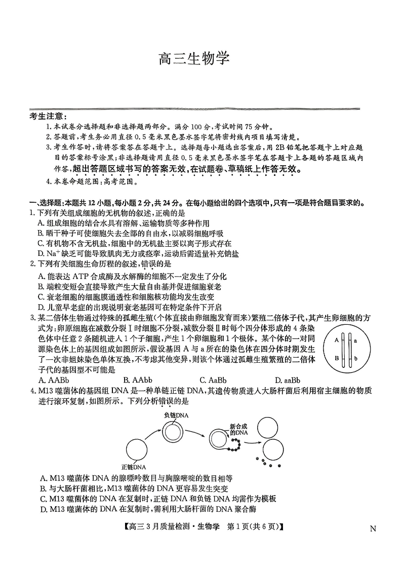 九师联盟2024-2025学年下学期3月高三质量检测生物