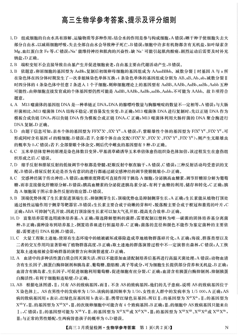 九师联盟2024-2025学年下学期3月高三质量检测生物答案