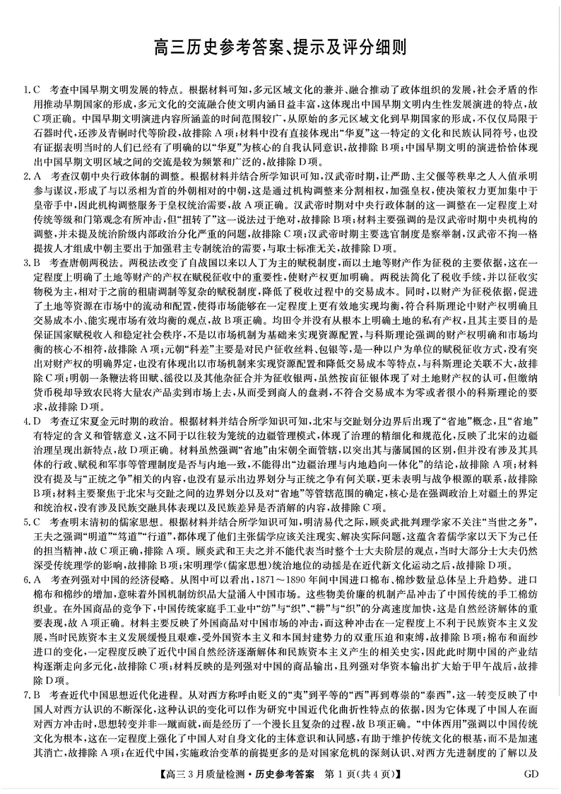 九师联盟2024-2025学年下学期3月高三质量检测历史答案