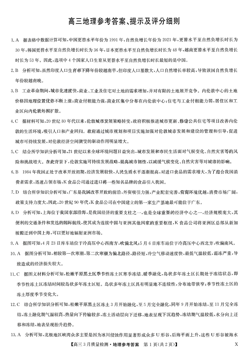 九师联盟2024-2025学年下学期3月高三质量检测地理答案