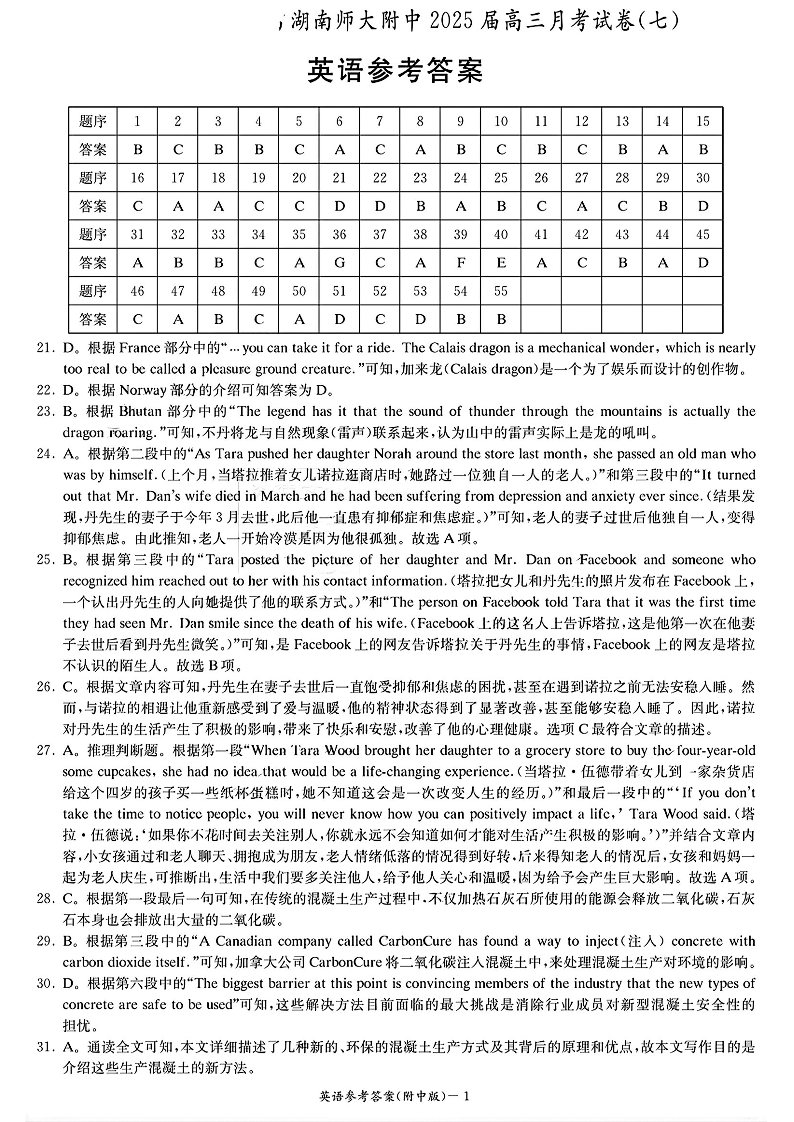 湖南省师大附中2024-2025学年下学期3月高三月考(七)英语答案