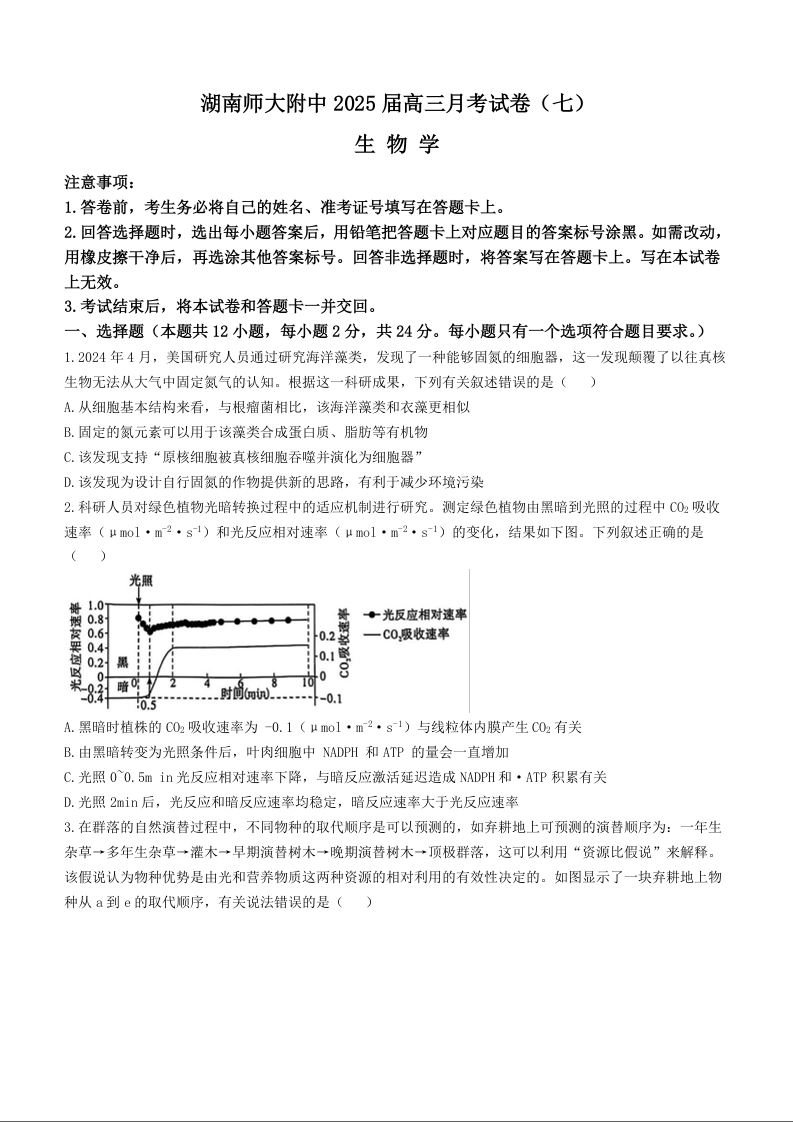 湖南省师大附中2024-2025学年下学期3月高三月考(七)生物+答案