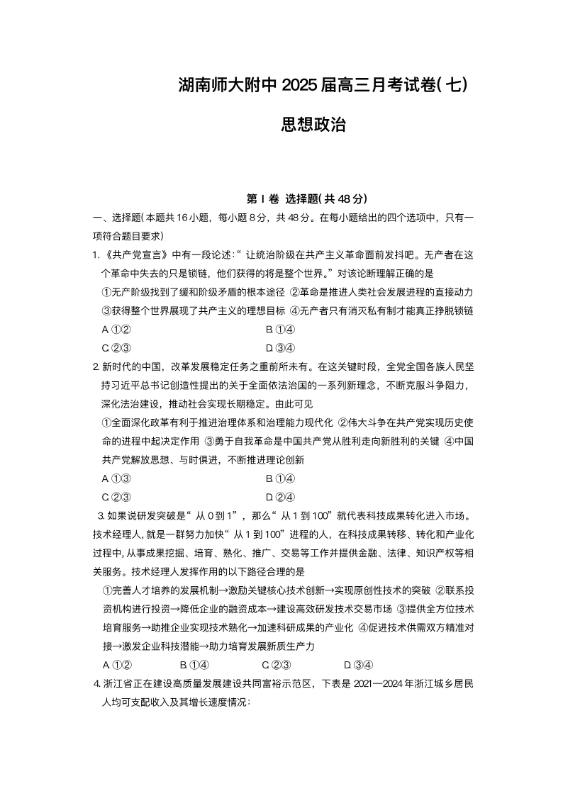 湖南省师大附中2024-2025学年下学期3月高三月考(七)政治+答案