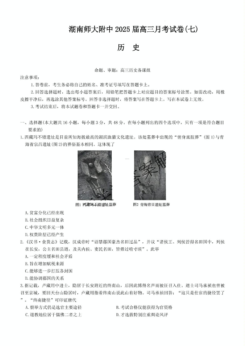 湖南省师大附中2024-2025学年下学期3月高三月考(七)历史+答案