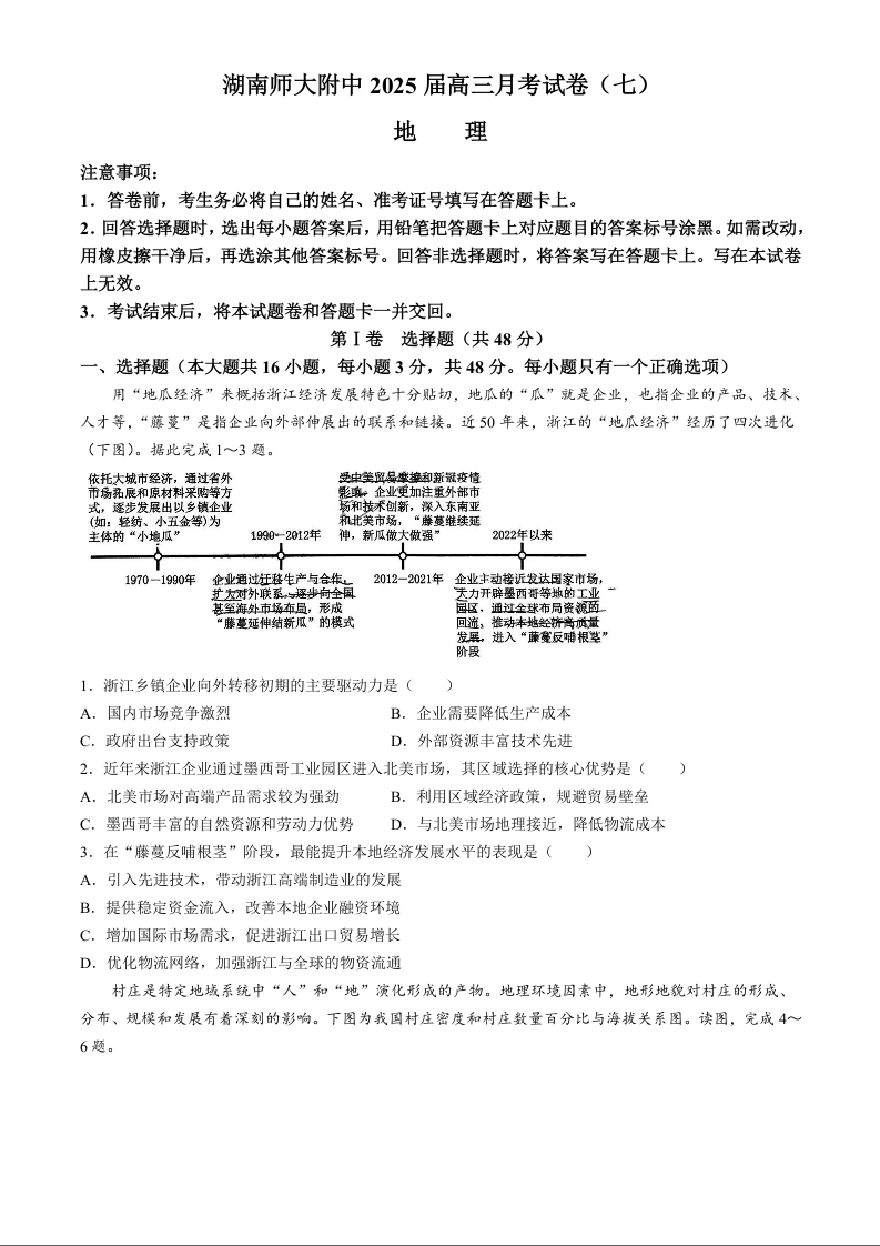 湖南省师大附中2024-2025学年下学期3月高三月考(七)地理+答案