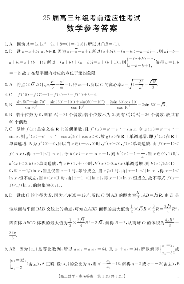 安徽省六安市2024-202学年下学期高三考前适应性考试数学答案