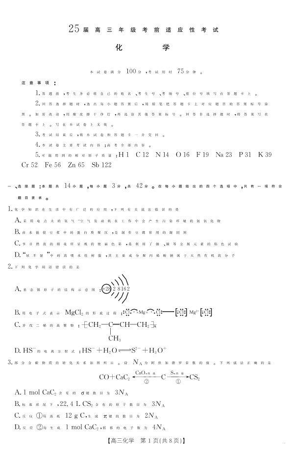 安徽省六安市2024-202学年下学期高三考前适应性考试化学