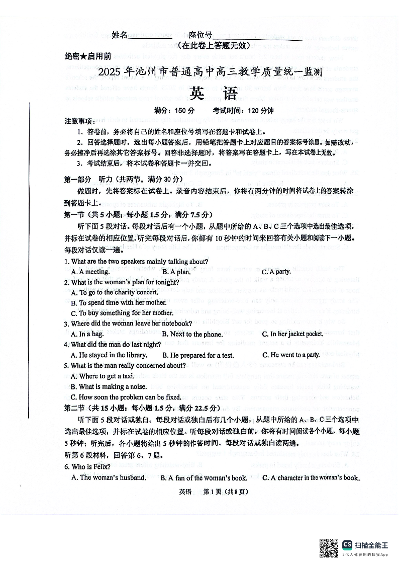 安徽省池州市2024-2025学年下学期3月高三二模监测英语