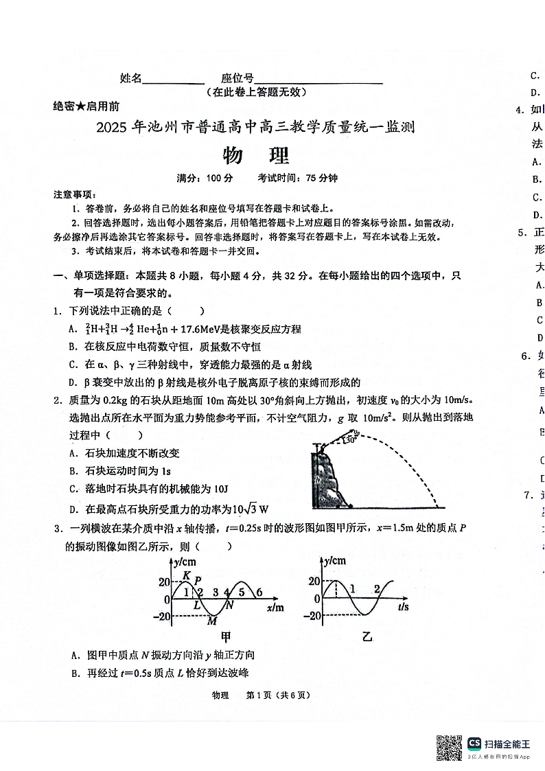 安徽省池州市2024-2025学年下学期3月高三二模监测物理