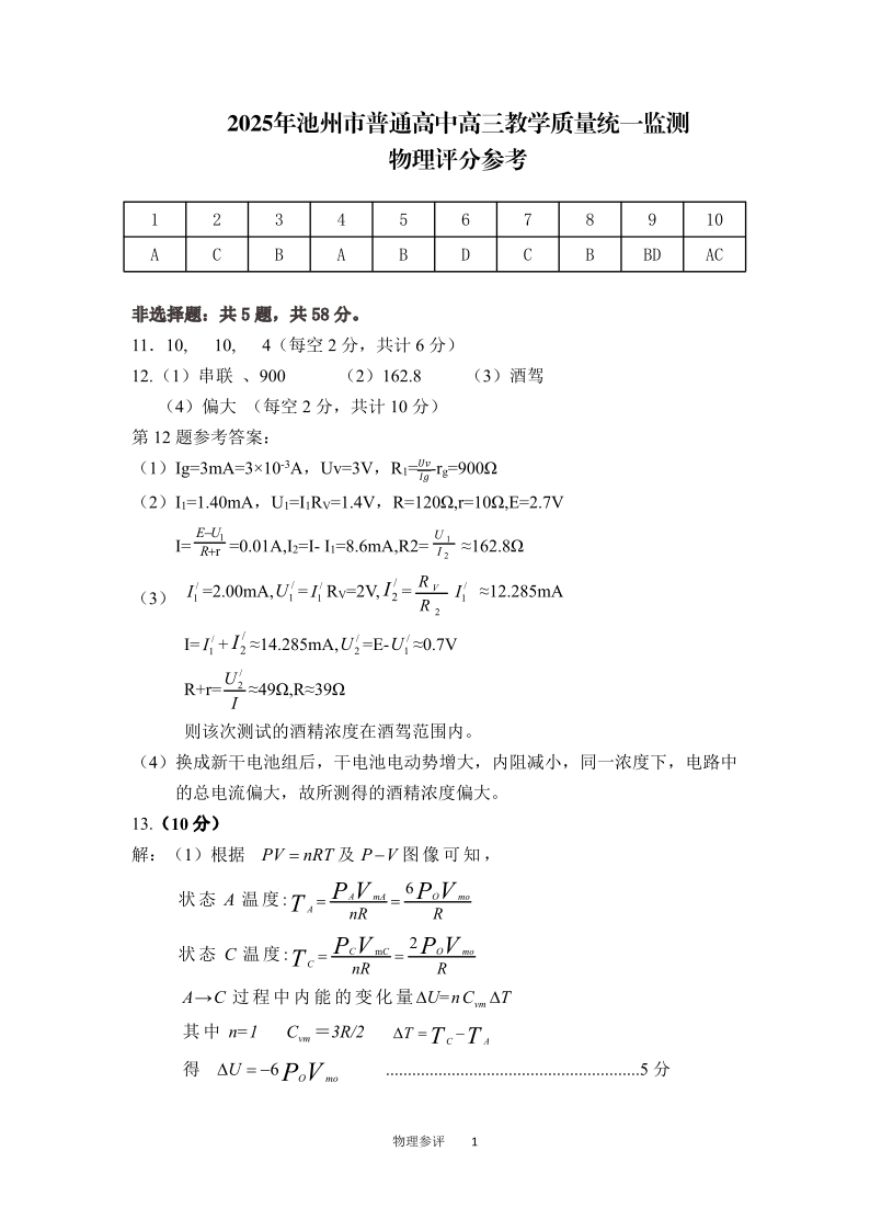 安徽省池州市2024-2025学年下学期3月高三二模监测物理答案