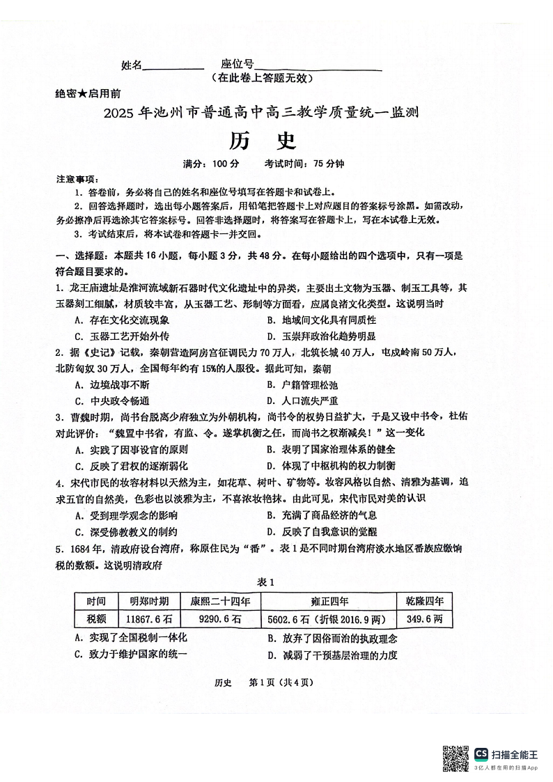 安徽省池州市2024-2025学年下学期3月高三二模监测历史